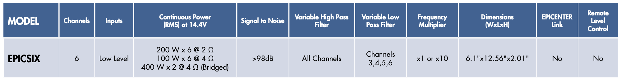 Built for installers who demand options—active 3-way front stage, 5-channel, active 6-channel, or a powerful bridged configuration. Whatever your design calls for, EPICSIX fits the plan and delivers. One amplifier delivers so many possibilites, giving you the freedom to build, tune and evolve your system, not limit it.